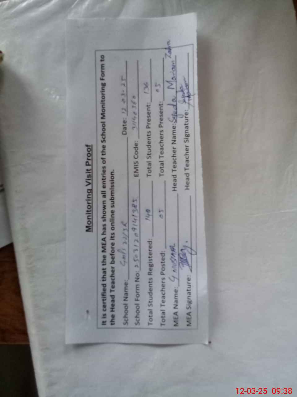| Attendance Register | Head Teacher | MEA with School | Visit Proof |