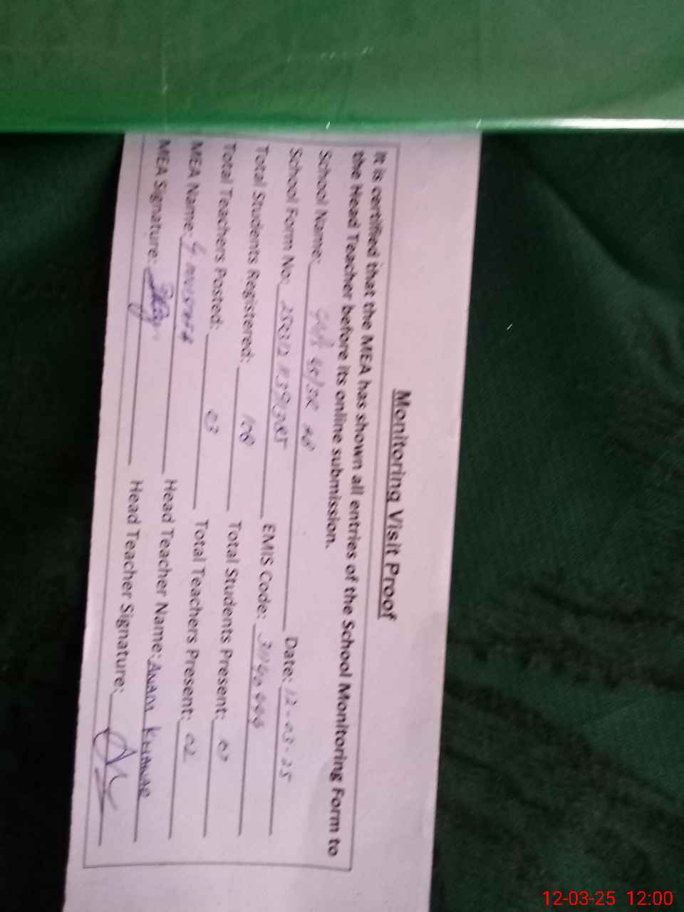 | Attendance Register | Head Teacher | MEA with School | Visit Proof |
