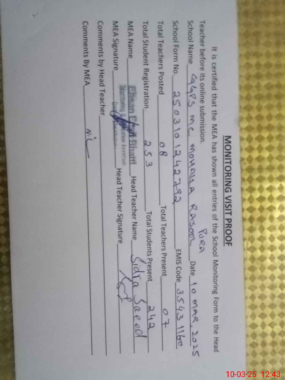 | Attendance Register | Head Teacher | MEA with School | Visit Proof |