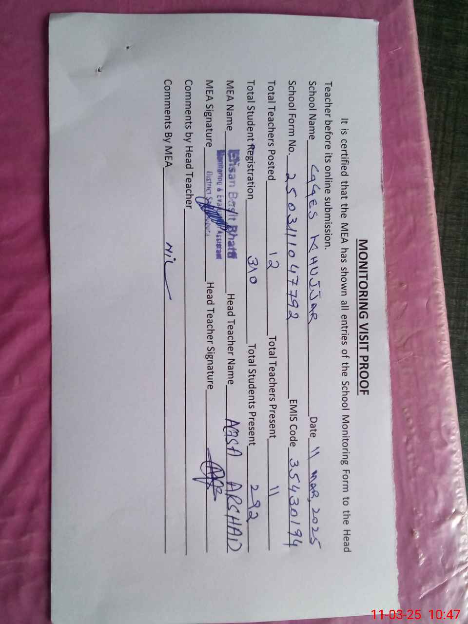 | Attendance Register | Head Teacher | MEA with School | Visit Proof |