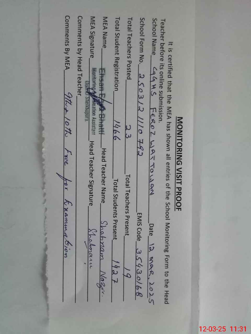 | EMIS Code: 35430168 | Name of School: GGHS FEROZ WATTOWAN | |||