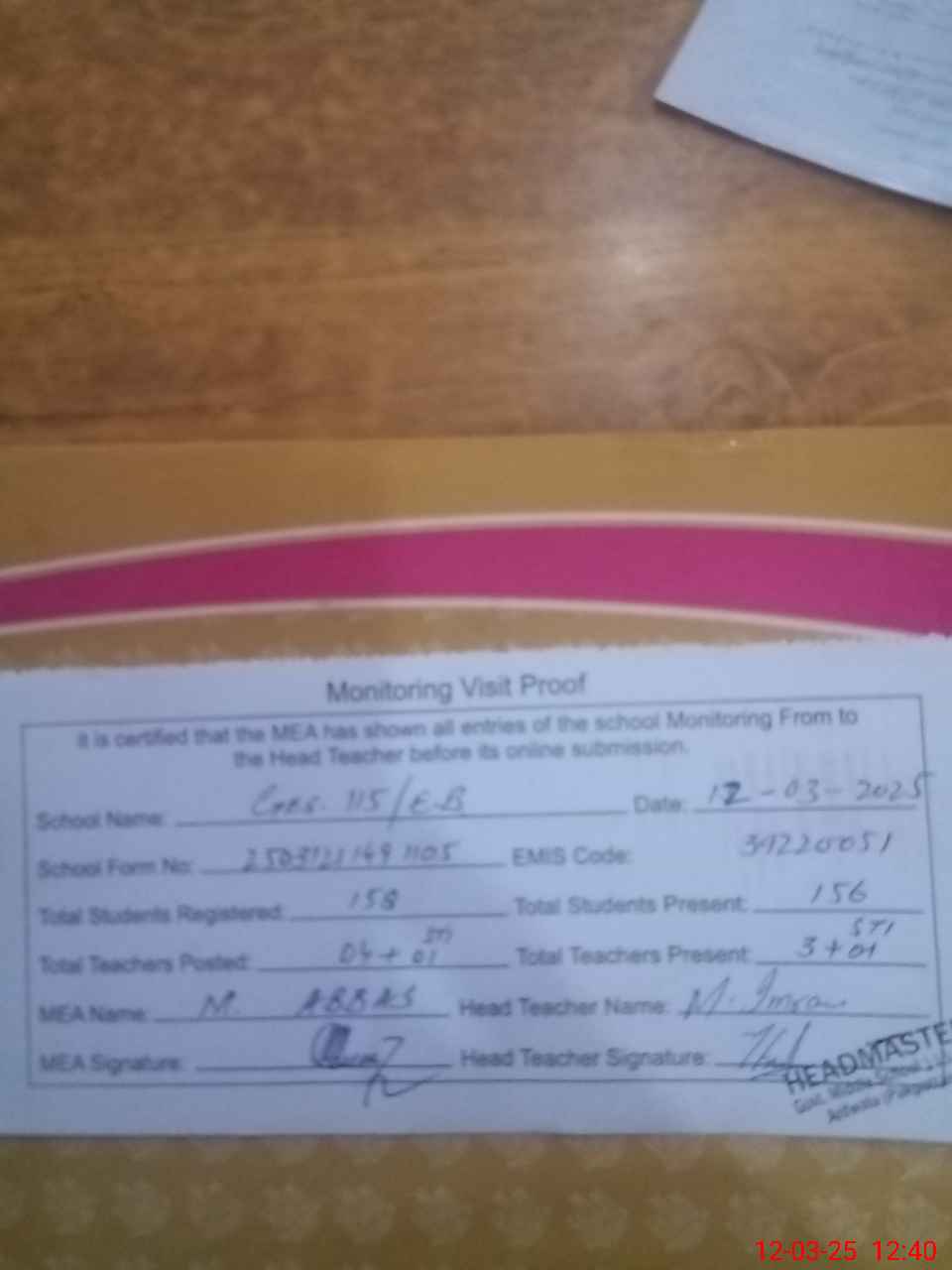 | Attendance Register | Head Teacher | MEA with School | Visit Proof |
