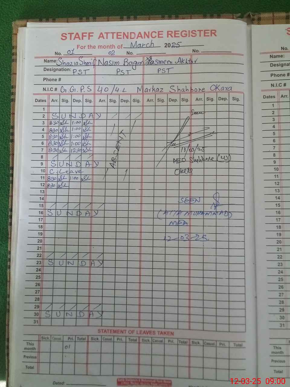 | CNIC | Full Name | Designation | R/C | Absence During Last Calender Month |