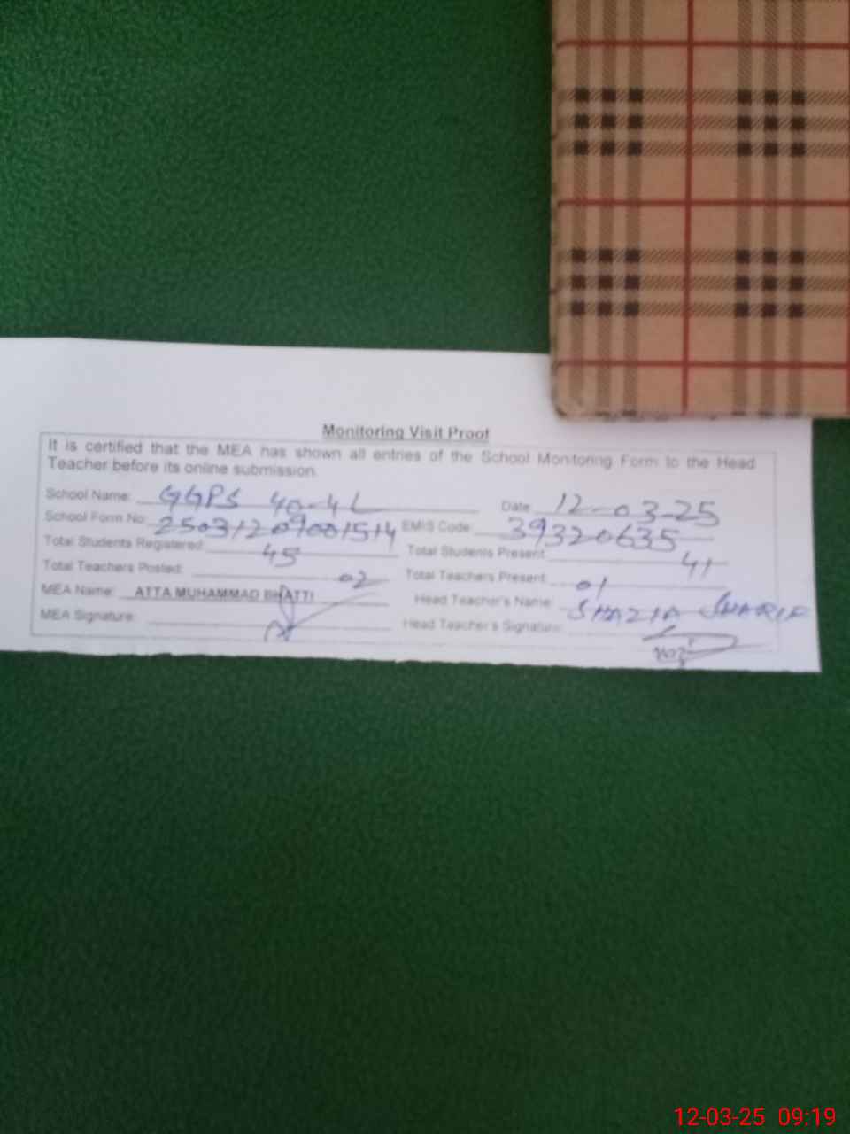 | Attendance Register | Head Teacher | MEA with School | Visit Proof |
