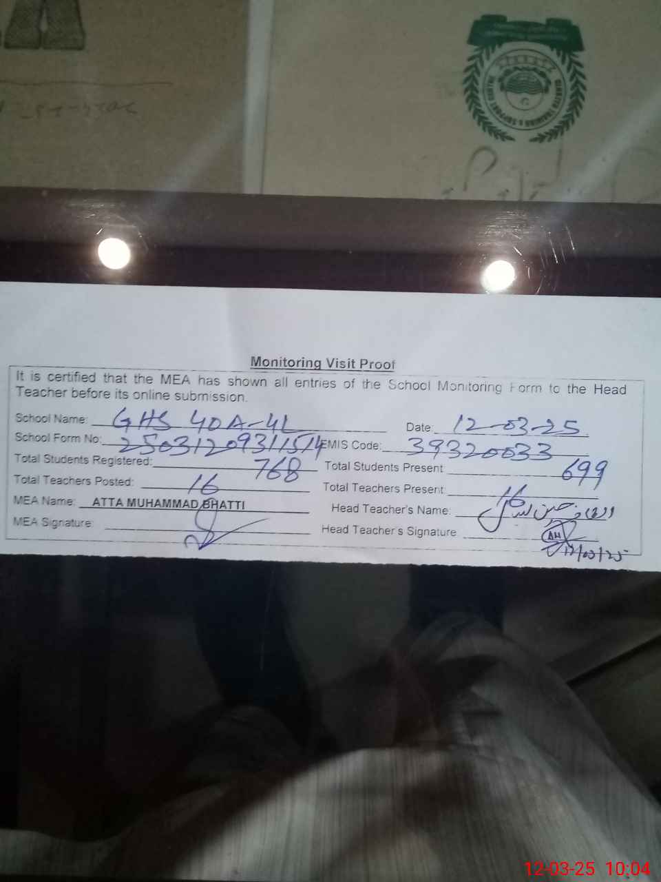 | EMIS Code: 39320033 | Name of School: GHS 40-A/4-L | |||