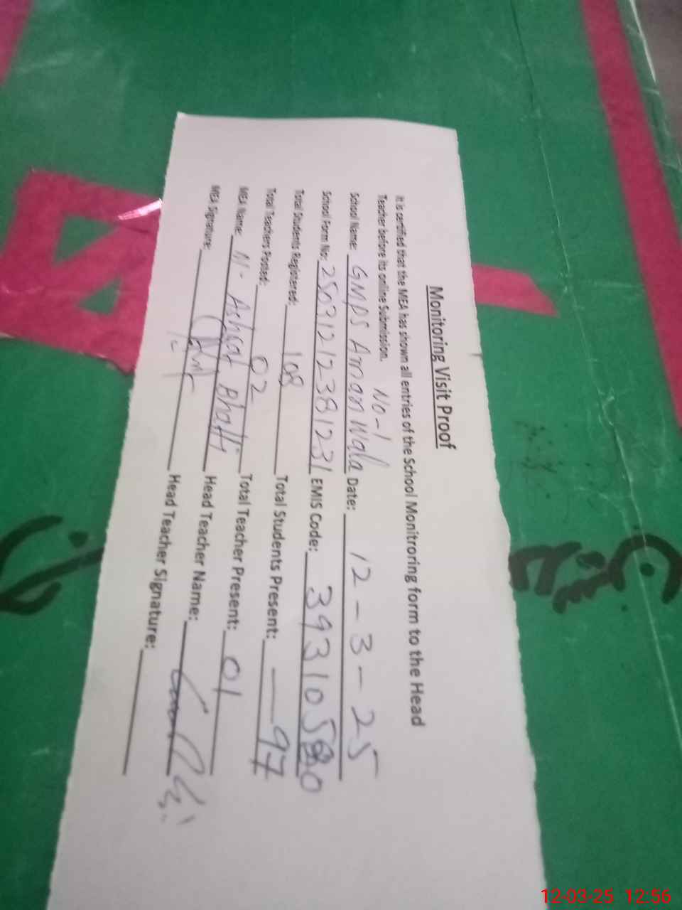 | Attendance Register | Head Teacher | MEA with School | Visit Proof |