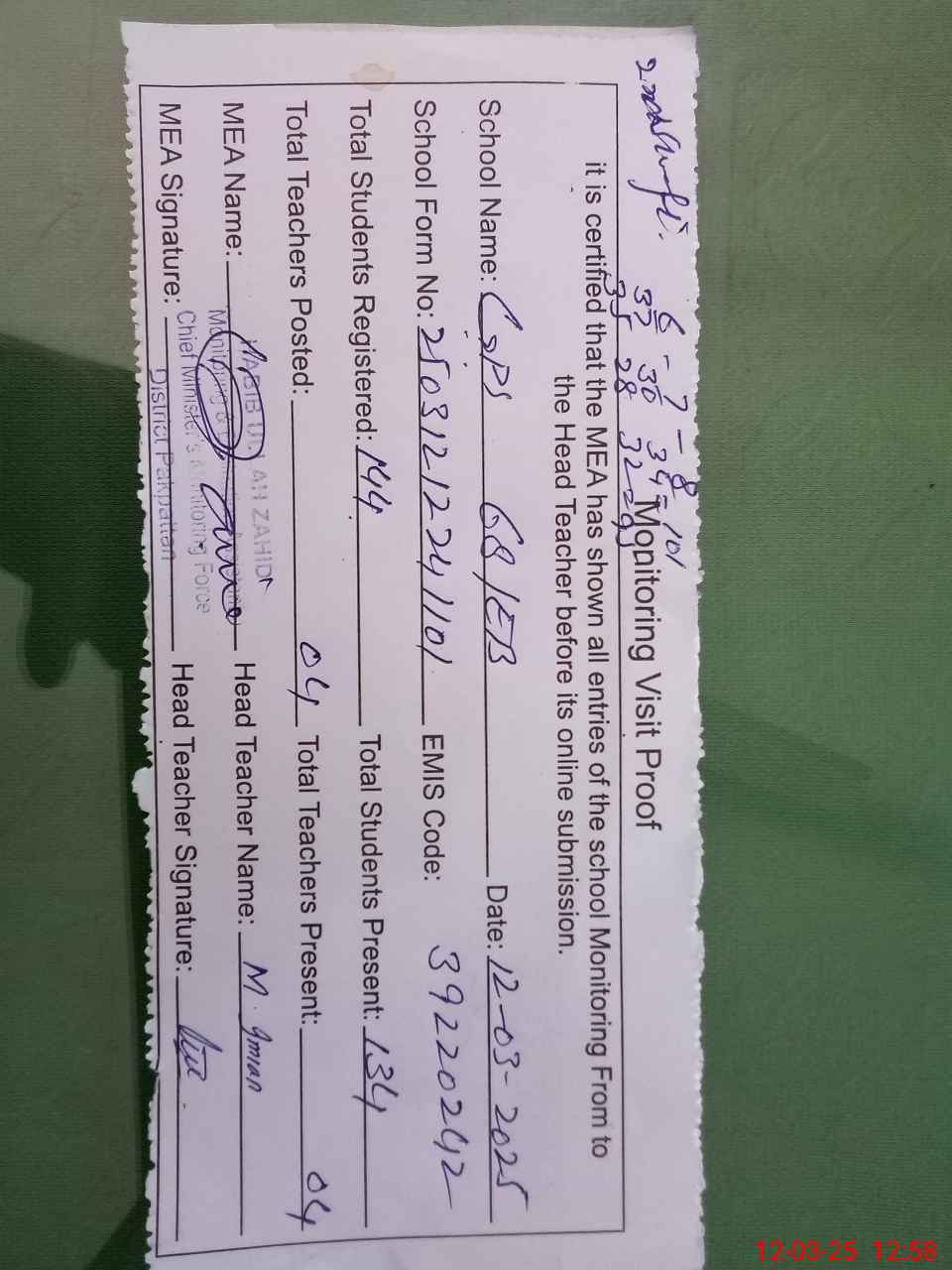 | Attendance Register | Head Teacher | MEA with School | Visit Proof |