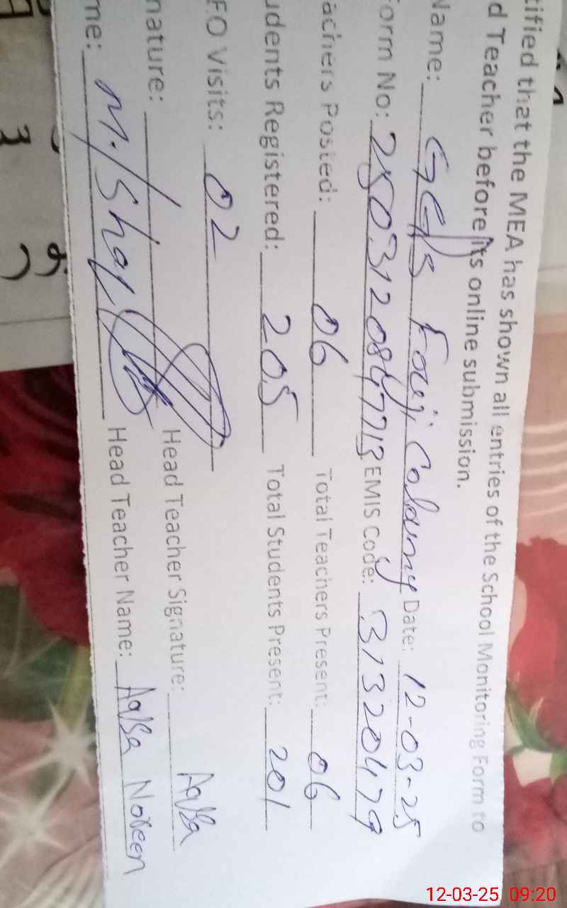 | EMIS Code: 31320479 | Name of School: GGPS FOJI COLONY | |||