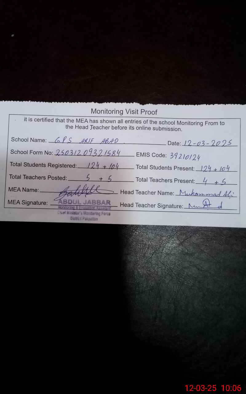 | EMIS Code: 39210124 | Name of School: GPS ARIF ABAD | |||