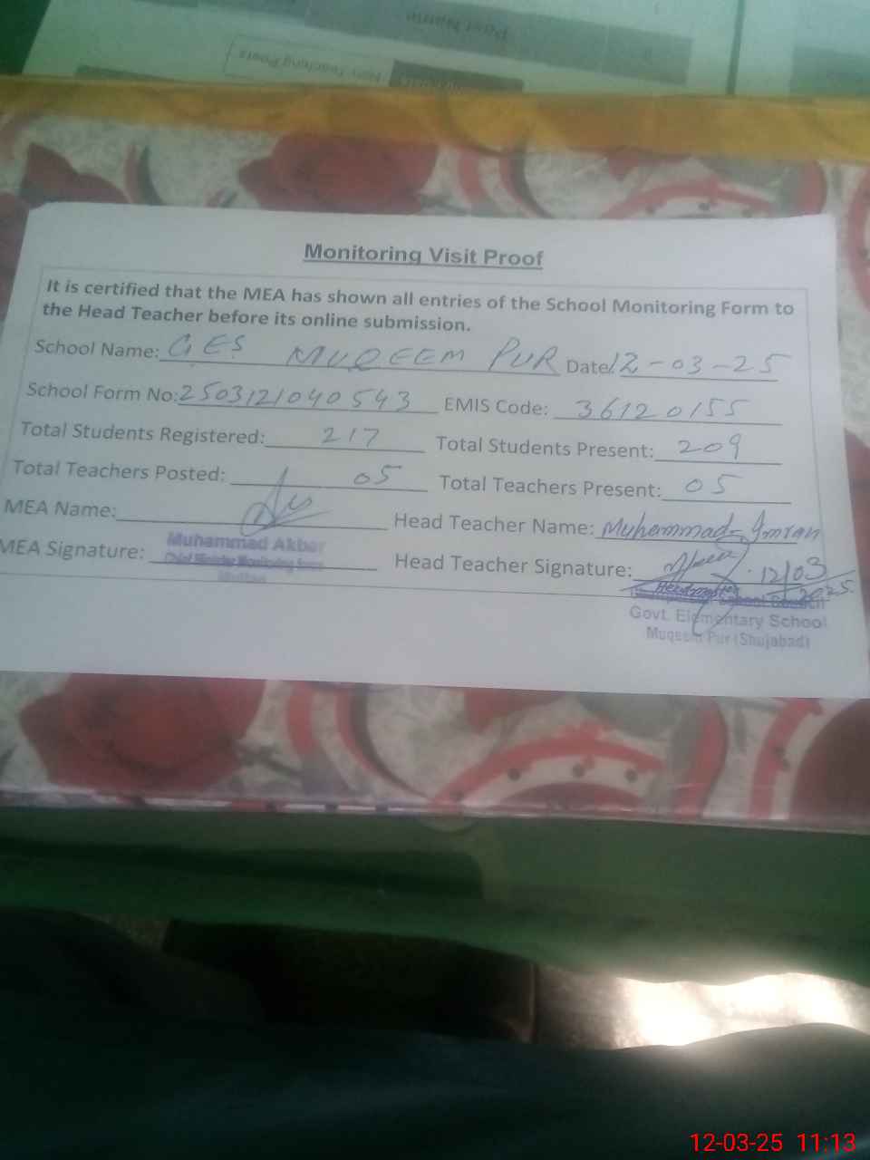 | EMIS Code: 36120155 | Name of School: GES MUQEEM PUR P/O MATOTLI SHUJABAD | |||