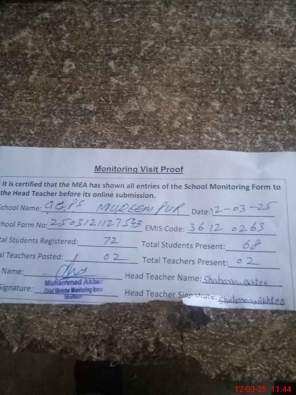 | Attendance Register | Head Teacher | MEA with School | Visit Proof |