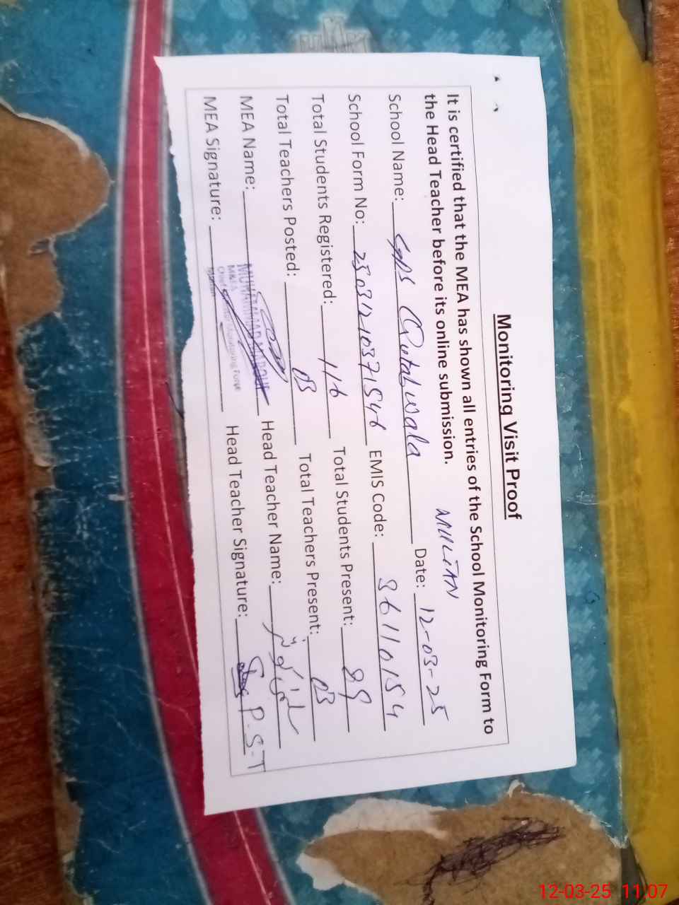 | Attendance Register | Head Teacher | MEA with School | Visit Proof |