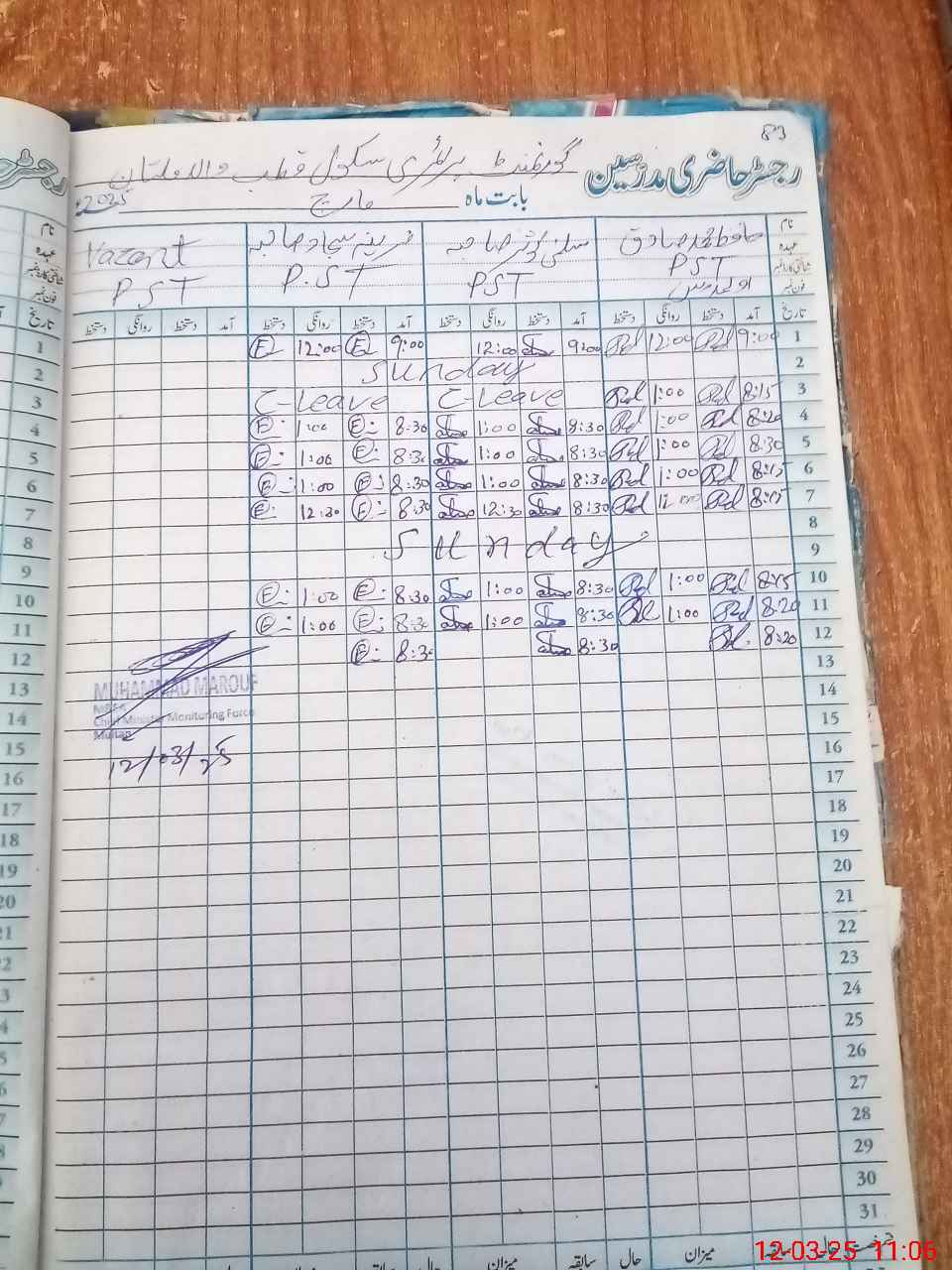 | CNIC | Full Name | Designation | R/C | Absence During Last Calender Month |