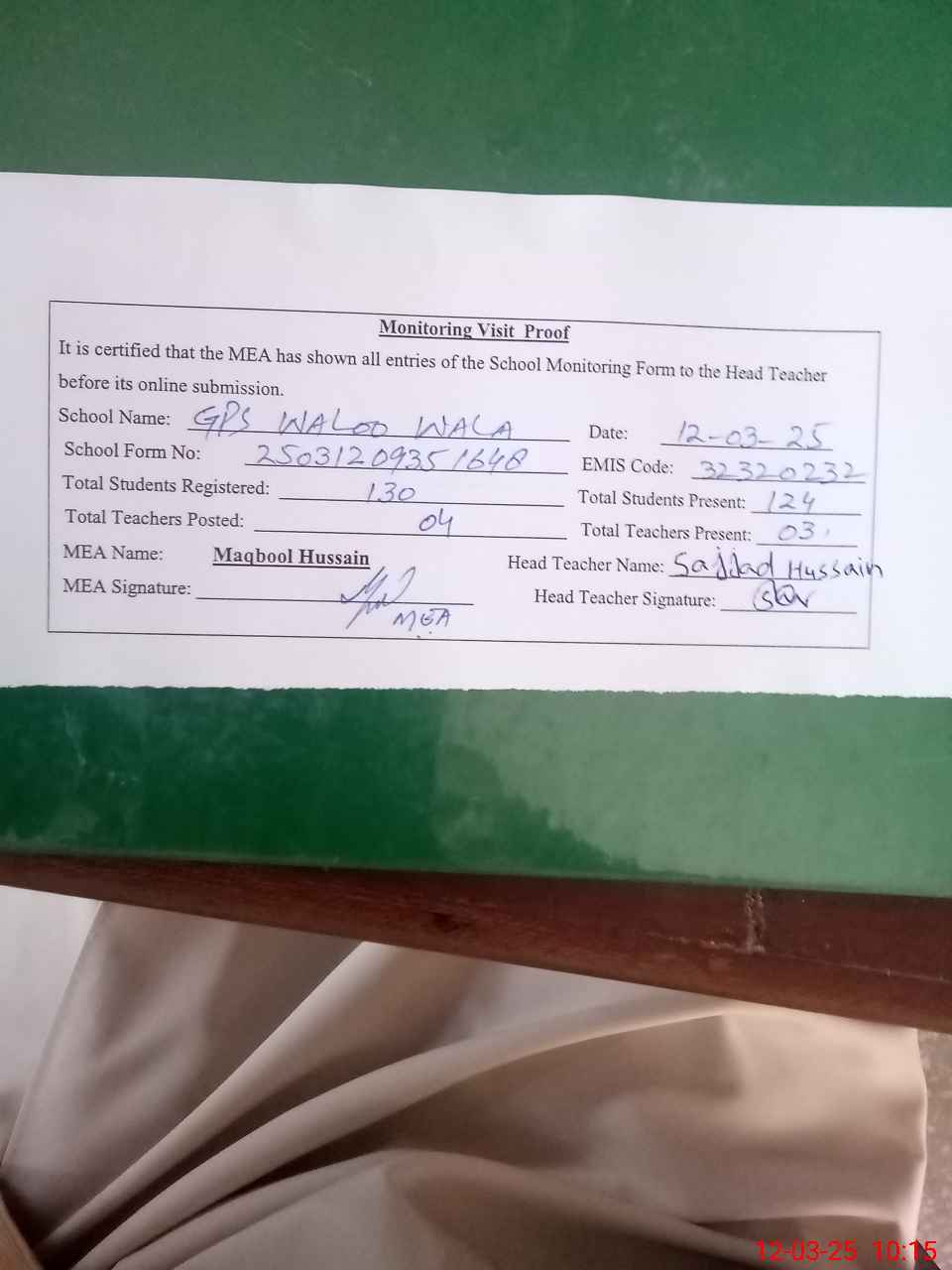 | Attendance Register | Head Teacher | MEA with School | Visit Proof |