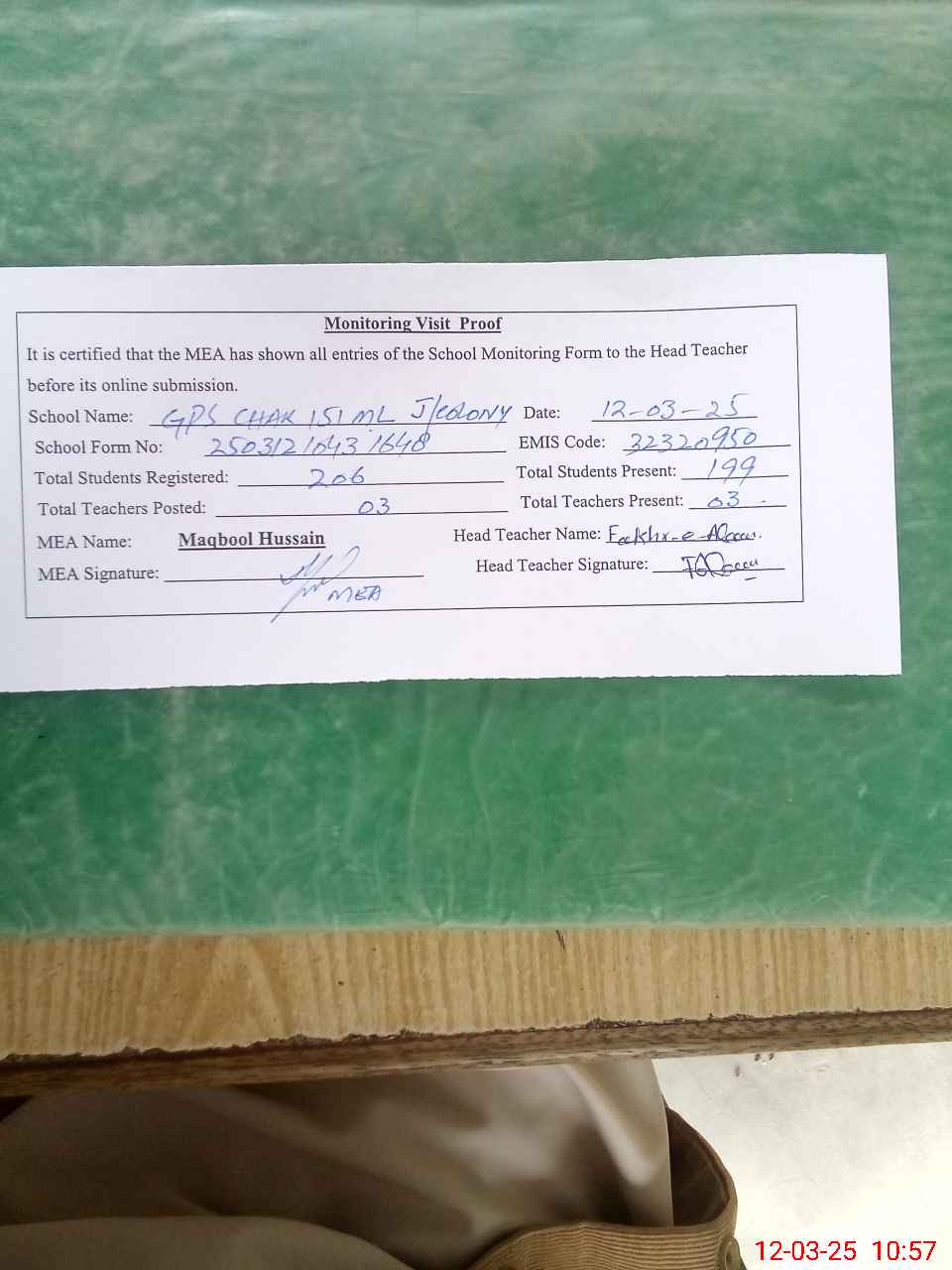 | EMIS Code: 32320950 | Name of School: GPS CHAK NO. 151 ML (JINNAH COLONY) | |||