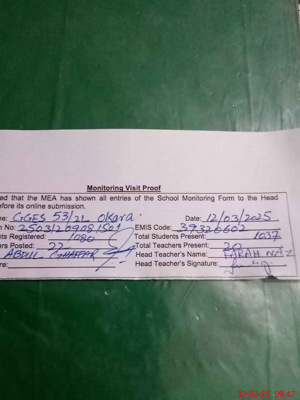 | Attendance Register | Head Teacher | MEA with School | Visit Proof |