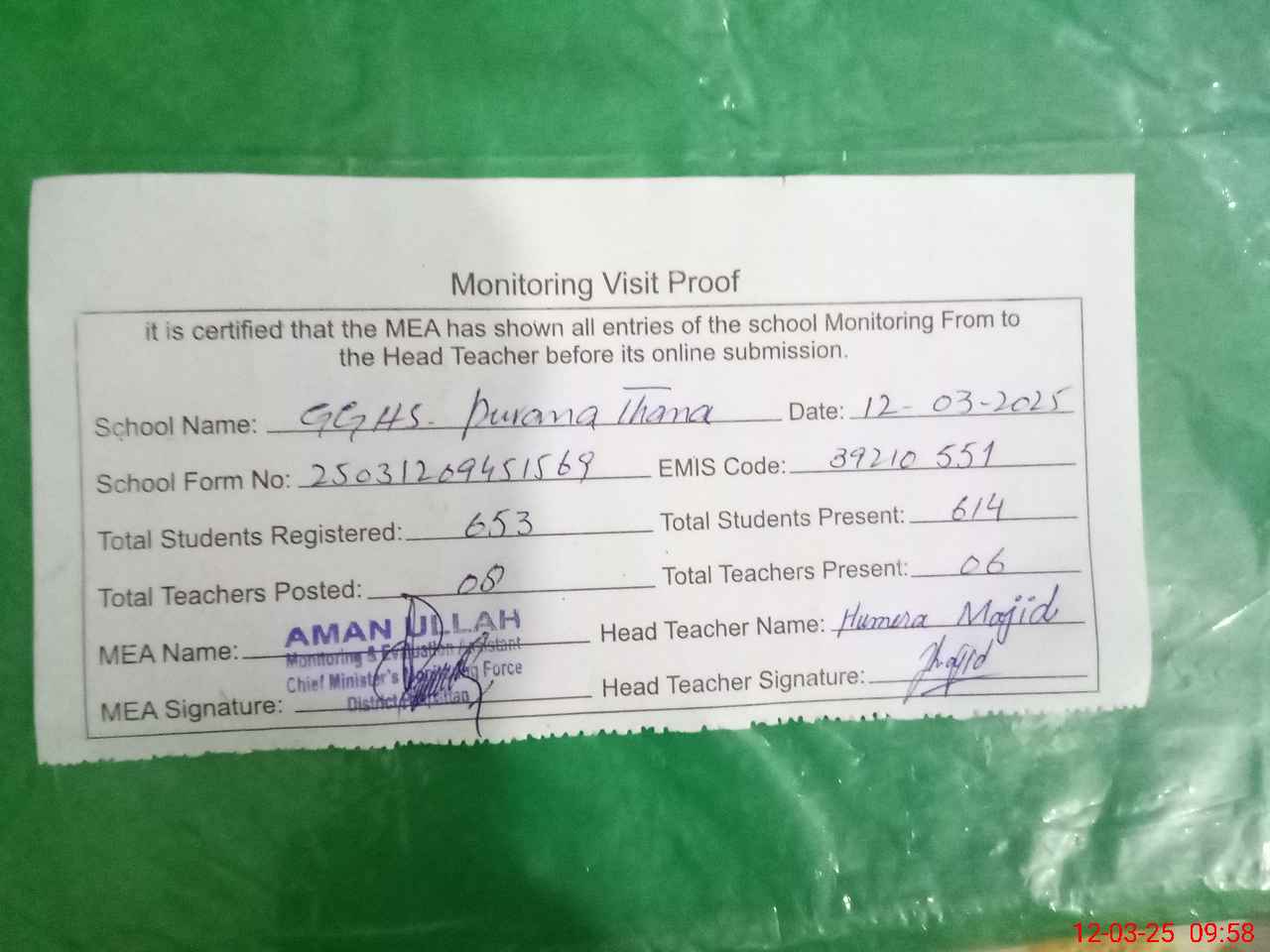| Attendance Register | Head Teacher | MEA with School | Visit Proof |