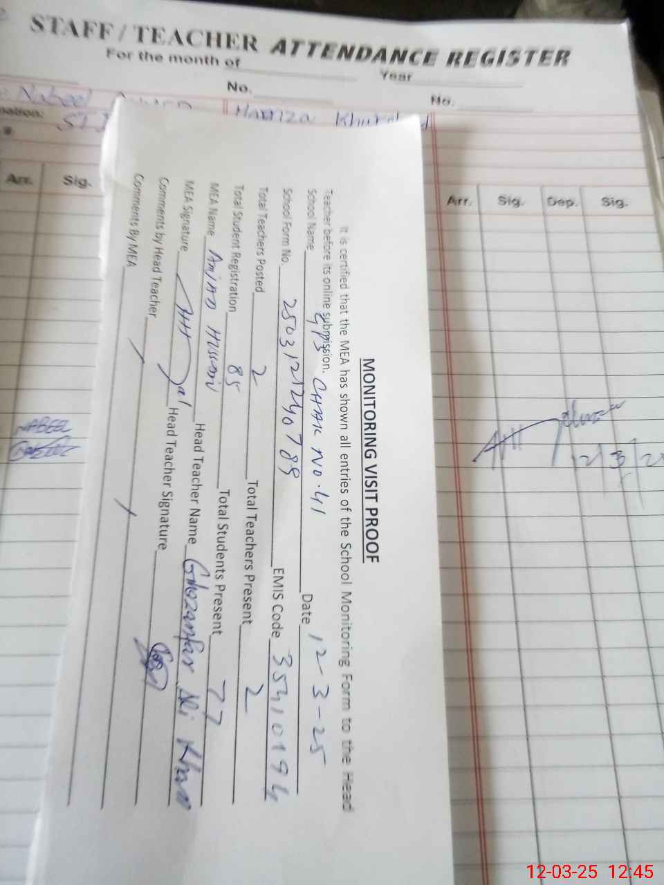 | Attendance Register | Head Teacher | MEA with School | Visit Proof |