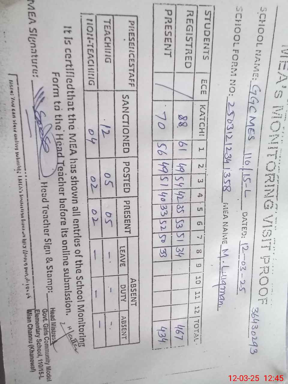 | Attendance Register | Head Teacher | MEA with School | Visit Proof |