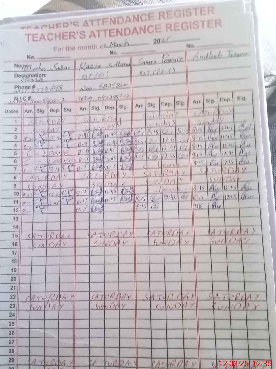 | CNIC | Full Name | Designation | R/C | Absence During Last Calender Month |