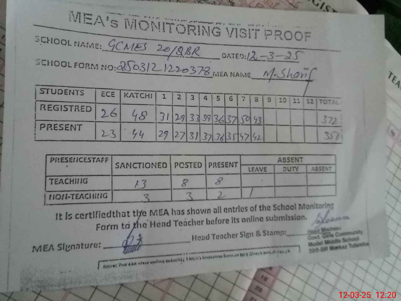 | Attendance Register | Head Teacher | MEA with School | Visit Proof |