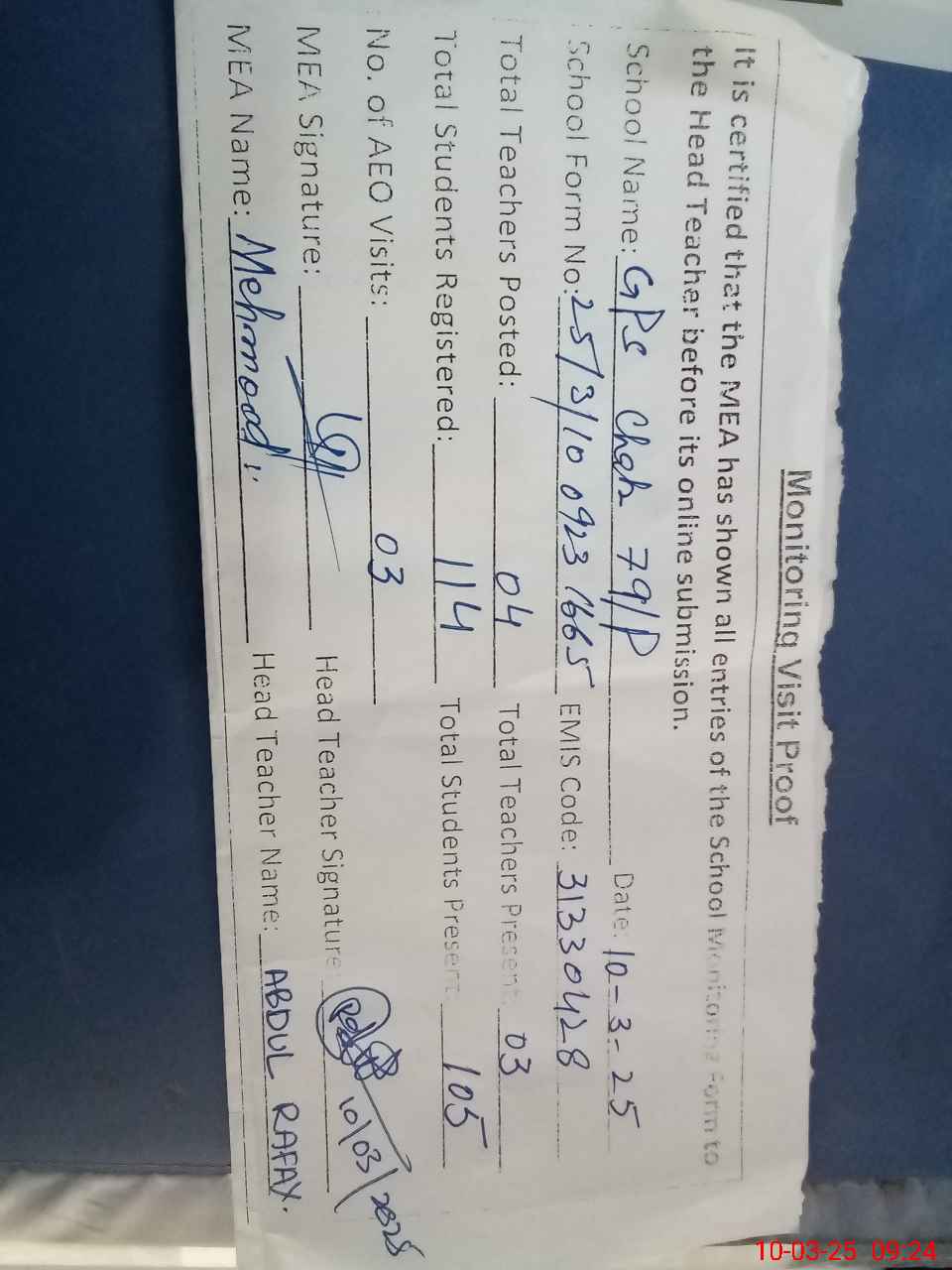 | Attendance Register | Head Teacher | MEA with School | Visit Proof |