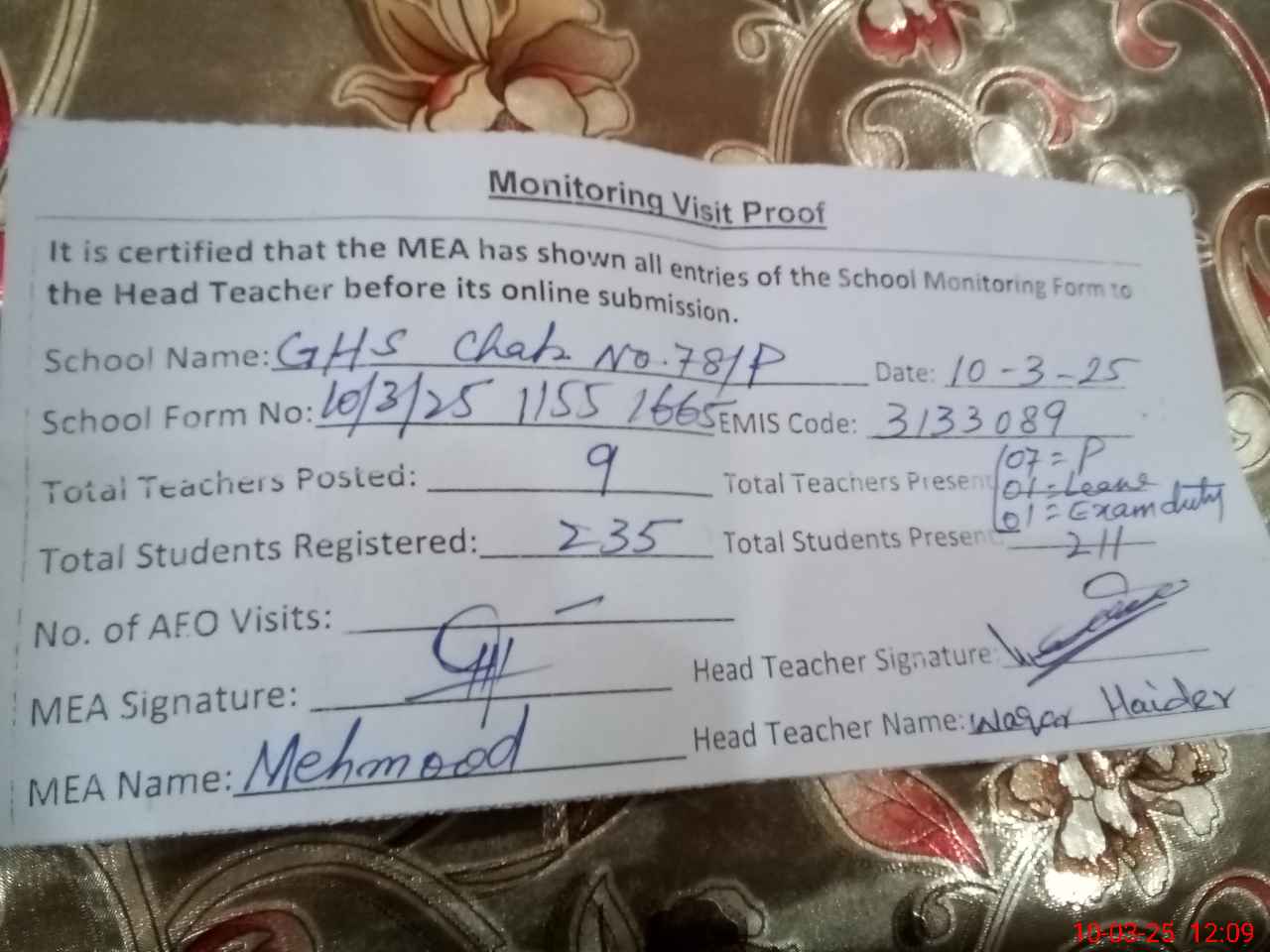 | Attendance Register | Head Teacher | MEA with School | Visit Proof |