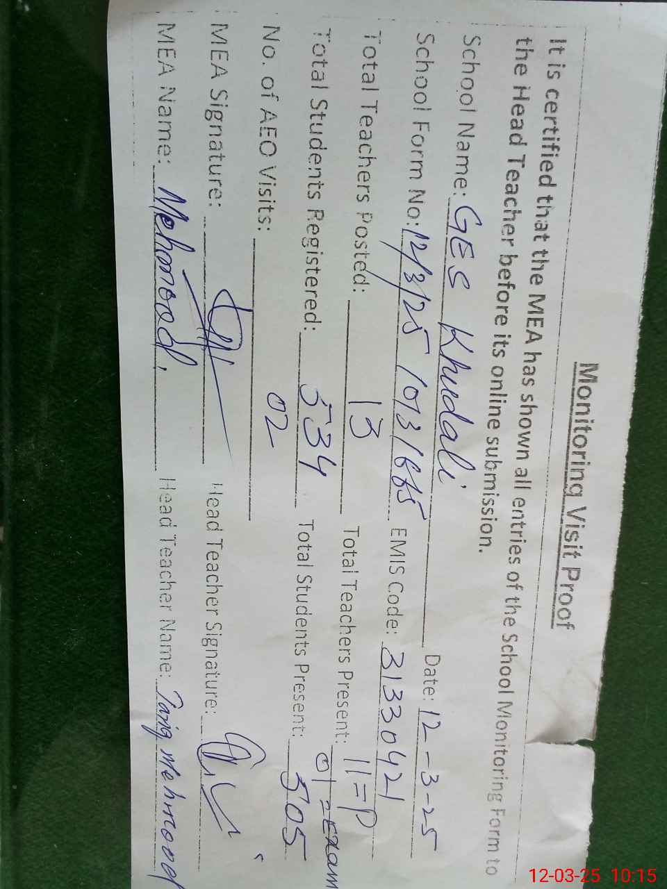 | Attendance Register | Head Teacher | MEA with School | Visit Proof |