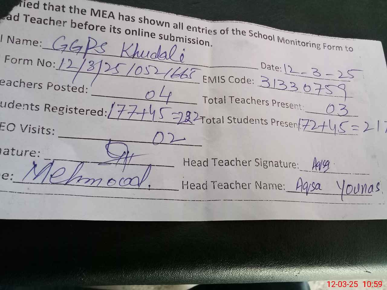| Monitoring Date: 12-03-2025 | Start Time: 12-03-2025 10:33 AM | End Time: 12-03-2025 10:59 AM | Name of MEA: Ma**** UlHa**** | |