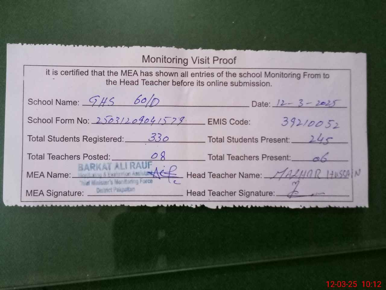 | EMIS Code: 39210052 | Name of School: GHS 60/D P/O CHAK BADIA | |||