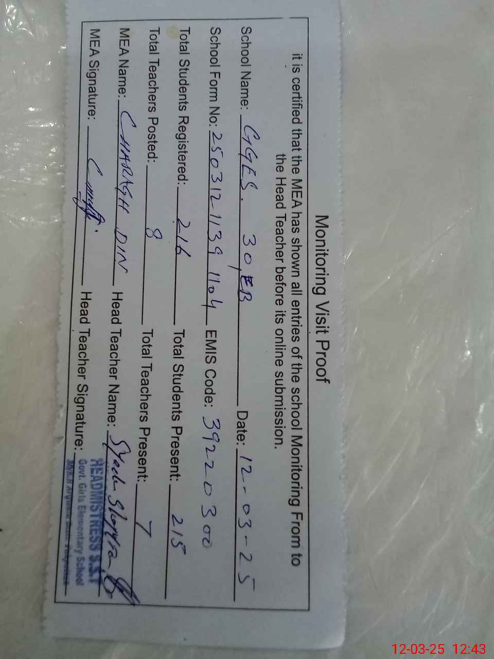 | Attendance Register | Head Teacher | MEA with School | Visit Proof |