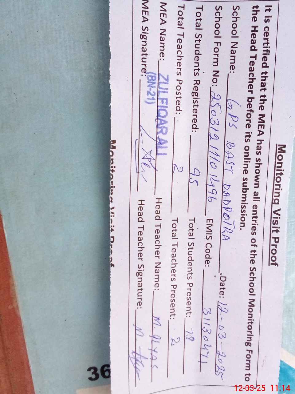 | Attendance Register | Head Teacher | MEA with School | Visit Proof |