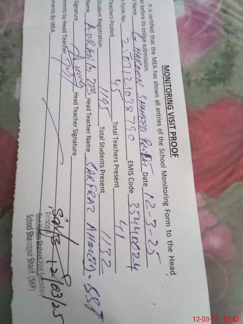 | EMIS Code: 35440024 | Name of School: GOVT. HAROON SHAHEED PILOT SECONDARY SCHOOL SHARAQPUR | |||