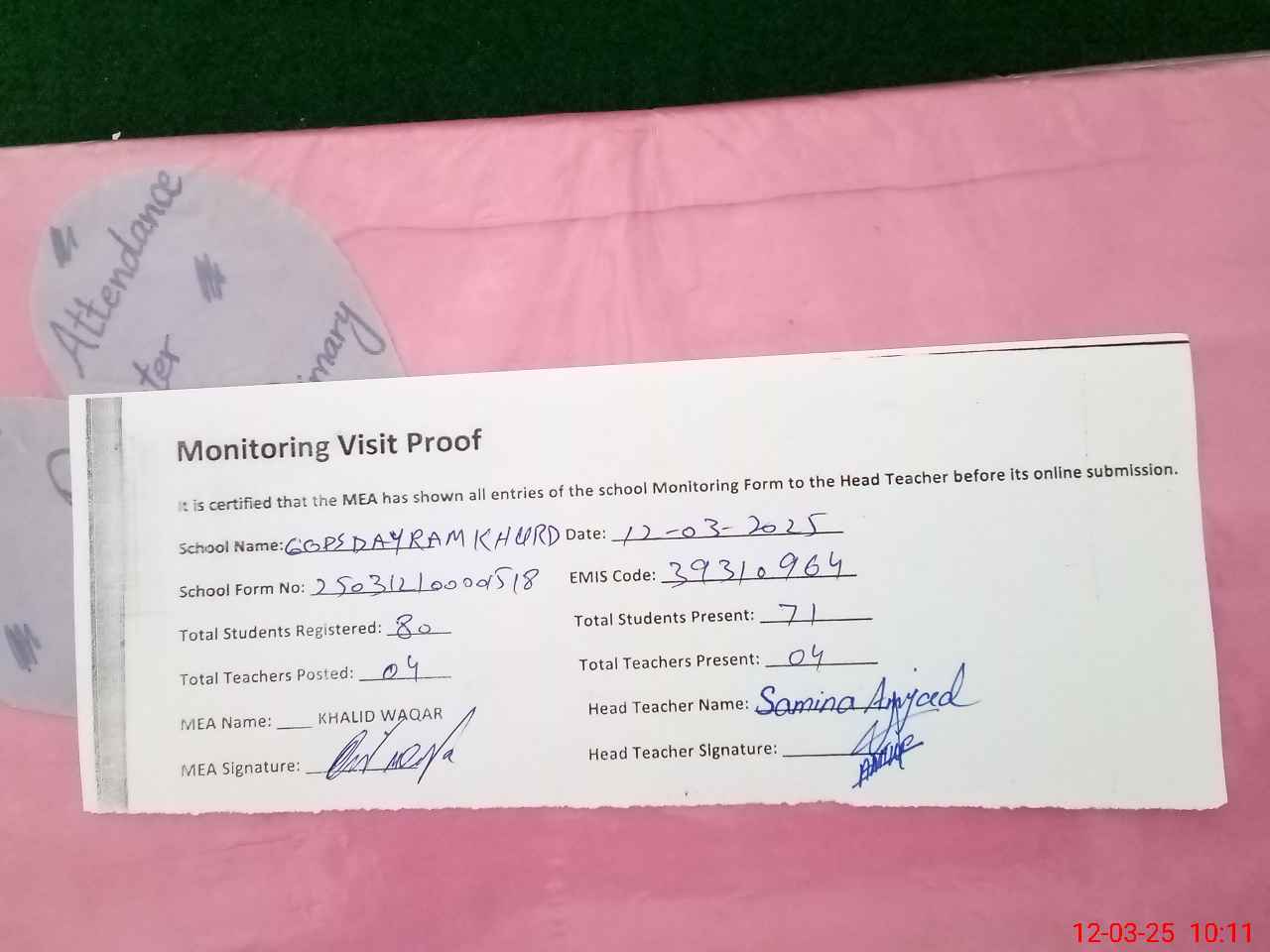 | EMIS Code: 39310964 | Name of School: GGPS DAYARAM KHURD | |||