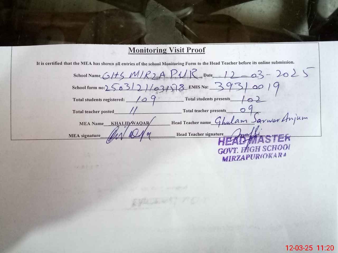 | EMIS Code: 39310019 | Name of School: GHS MIRZA PUR | |||