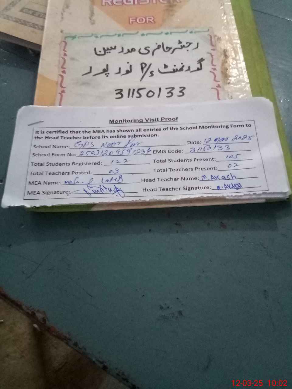 | EMIS Code: 31150133 | Name of School: GPS NOOR PUR | |||