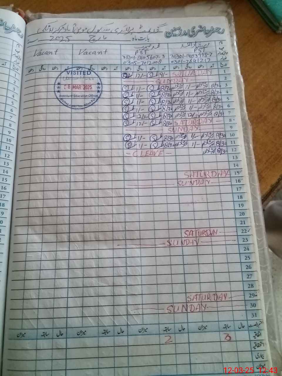 | Name: IR**** AH**** Designation: (School Headmaster's/Headmistress's) PST Phone/Cell Number: 03**** |