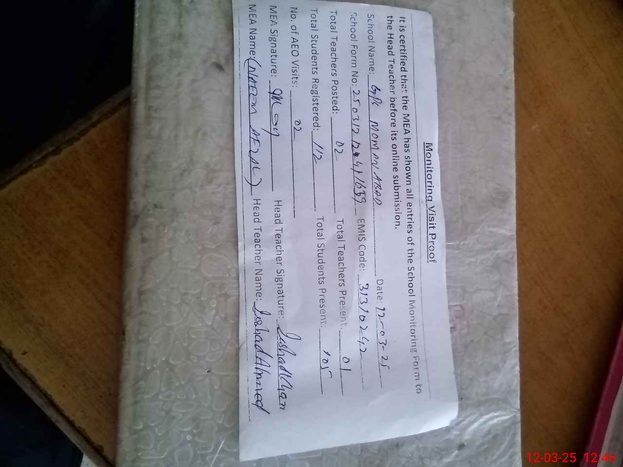 | EMIS Code: 31310242 | Name of School: GPS MOMAN ABAD | |||
