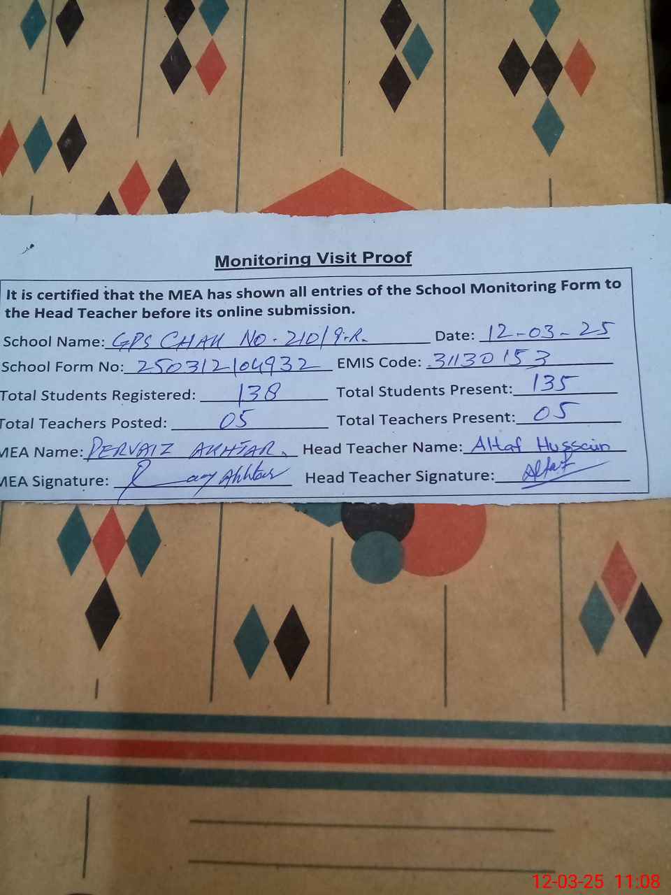 | Attendance Register | Head Teacher | MEA with School | Visit Proof |