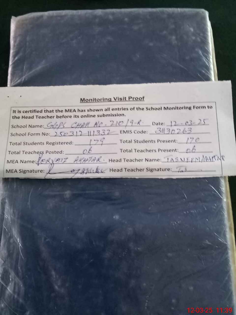 | Attendance Register | Head Teacher | MEA with School | Visit Proof |