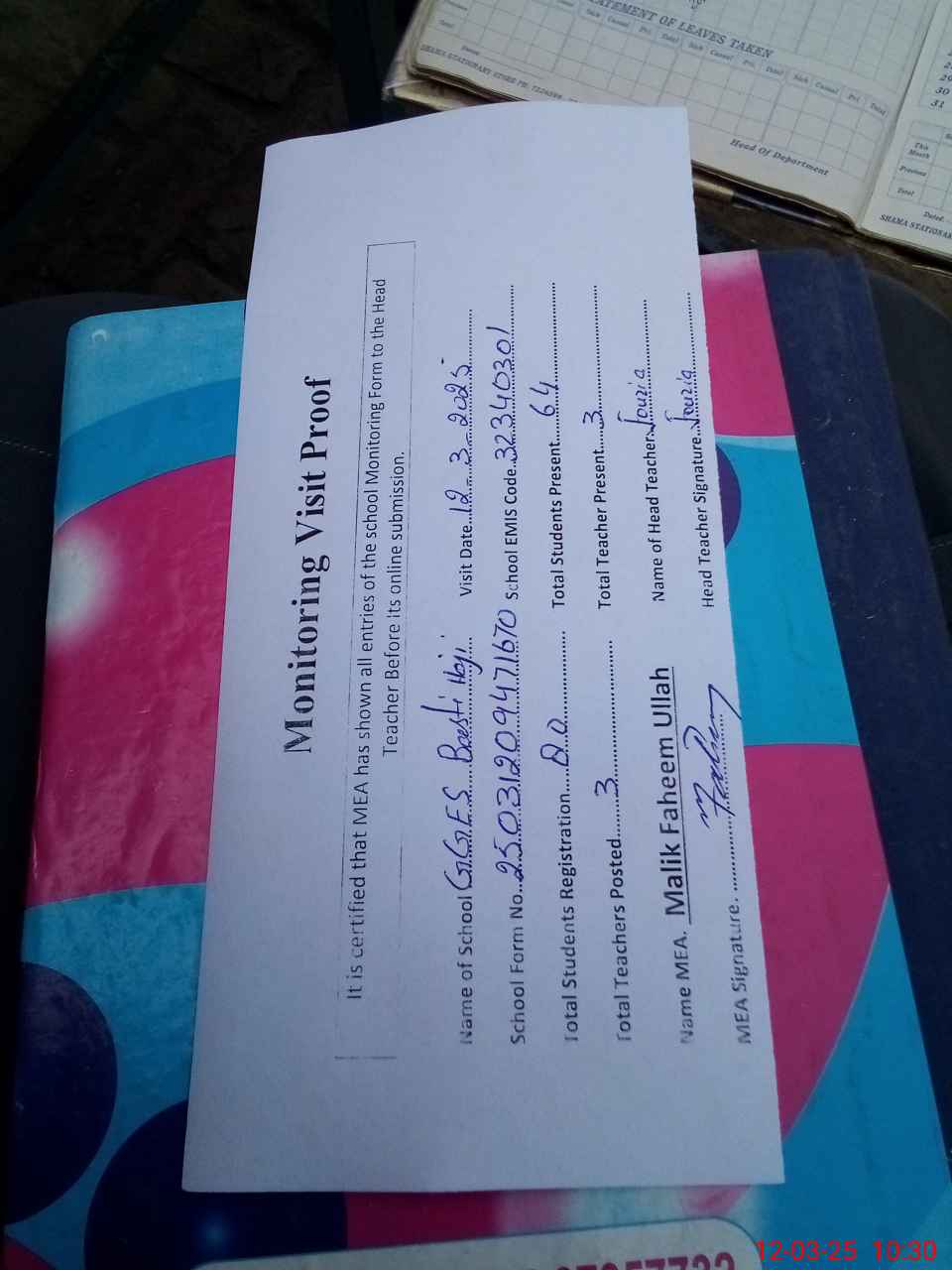 | Attendance Register | Head Teacher | MEA with School | Visit Proof |