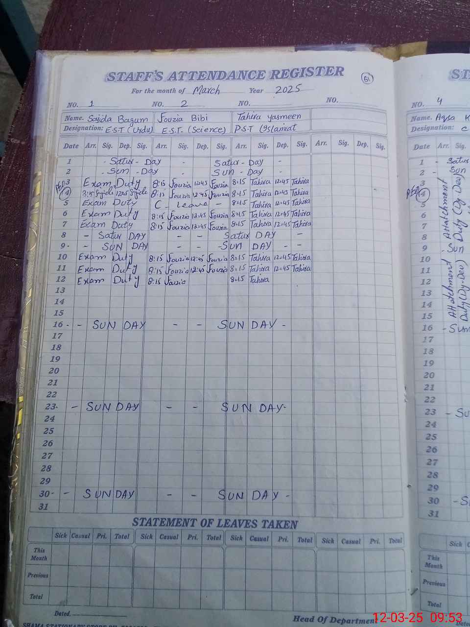 | 32**** | Sa**** Ba**** | 3 | 1 | 0 | 0 | 0 | 0 | 0 | 0 | 0 | 0 | 0 | Exam Duty |