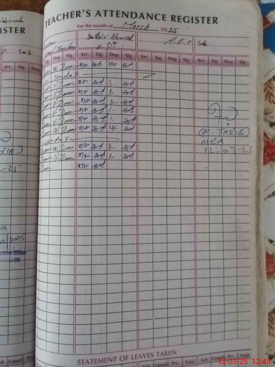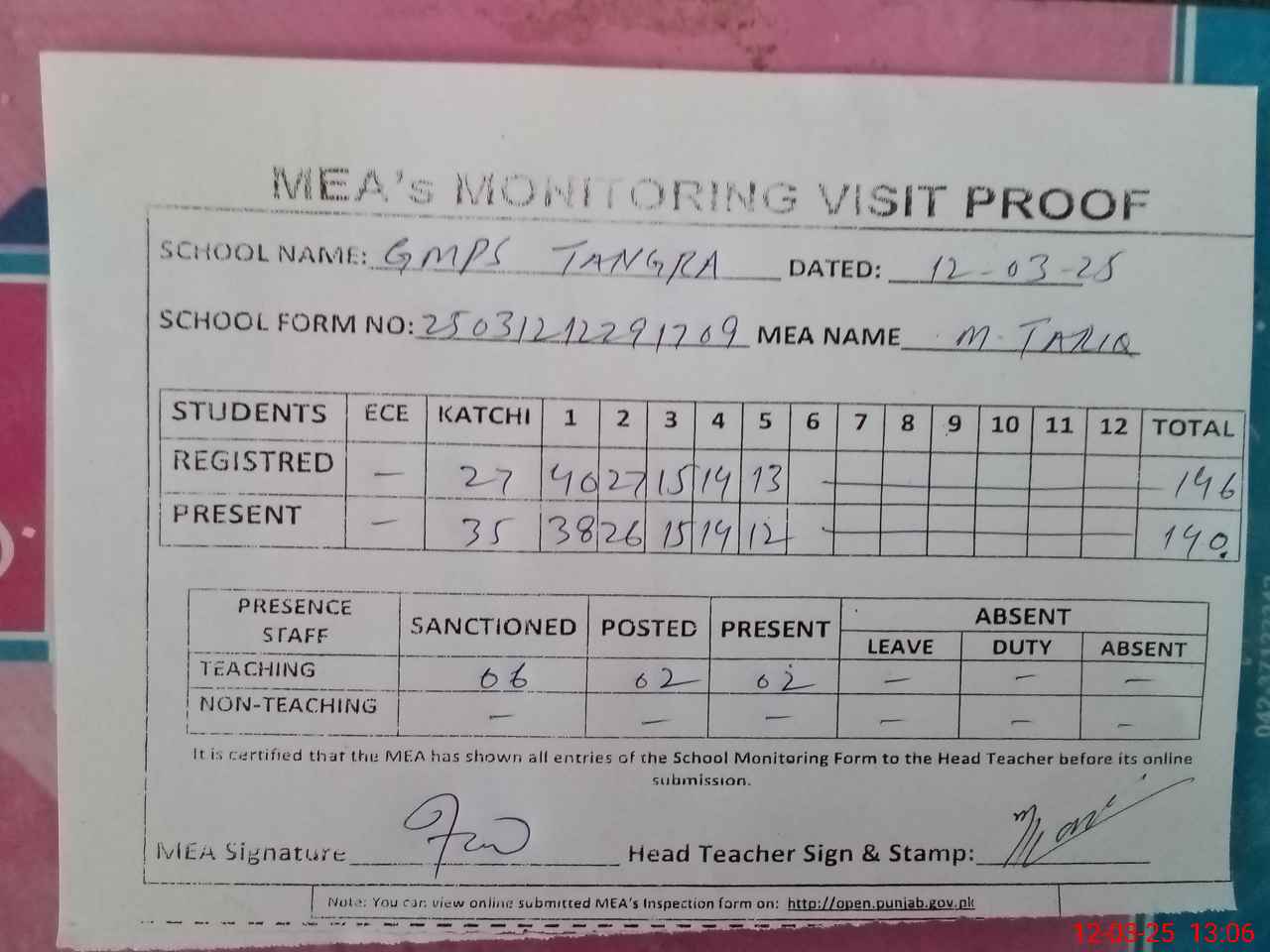 | Attendance Register | Head Teacher | MEA with School | Visit Proof |
