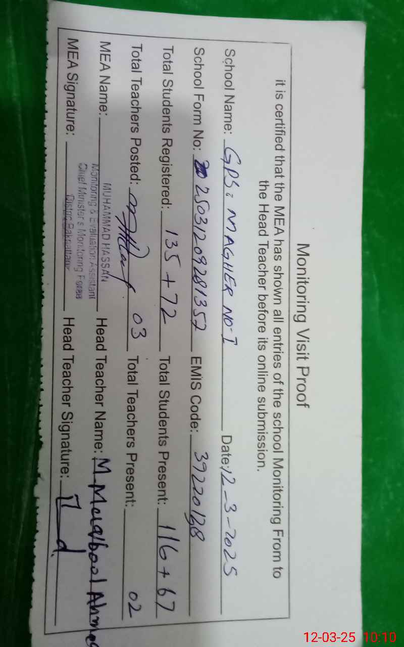 | EMIS Code: 39220138 | Name of School: GPS MAGHER NO. 1 | |||