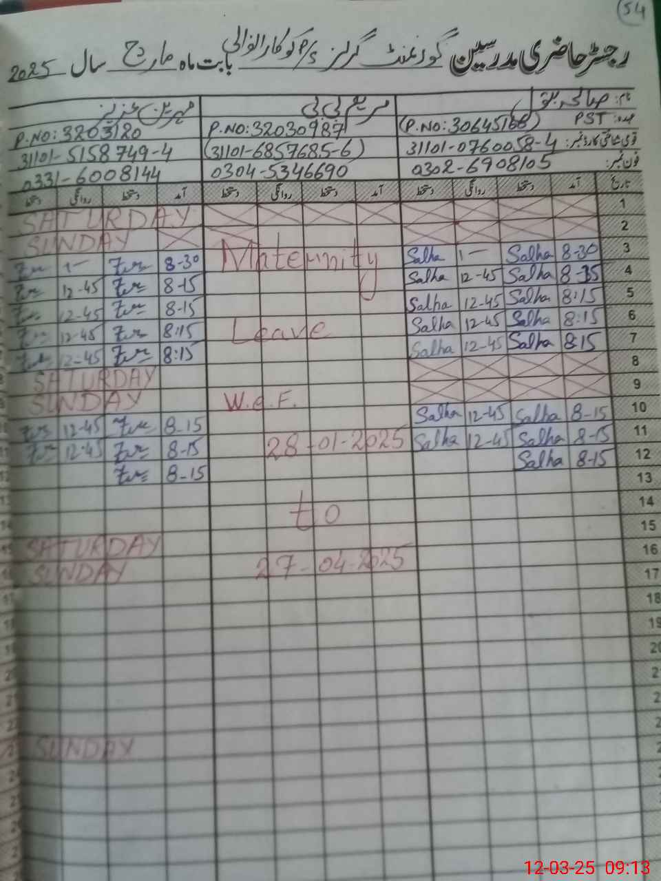 | 31**** | Ma**** Bi**** | PST | Regular | 28 | 0 | 0 | 28 | 0 | 0 | 0 | 0 | 0 | Maternity |