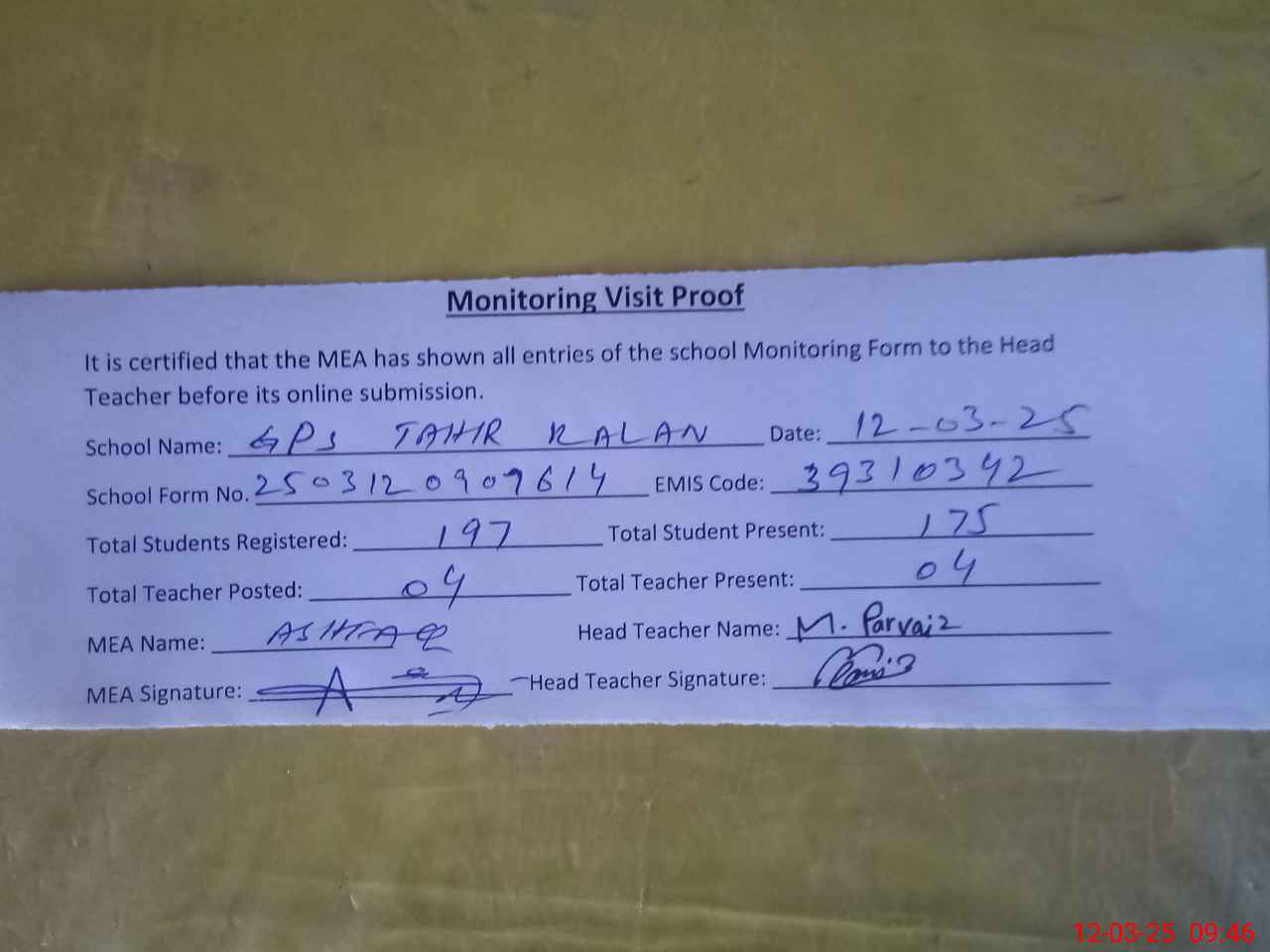 | Attendance Register | Head Teacher | MEA with School | Visit Proof |