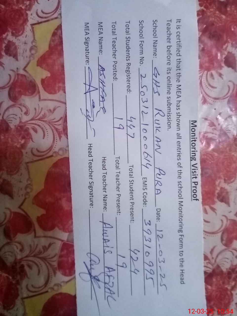 | EMIS Code: 39310995 | Name of School: GHS RUKAN PURA | |||