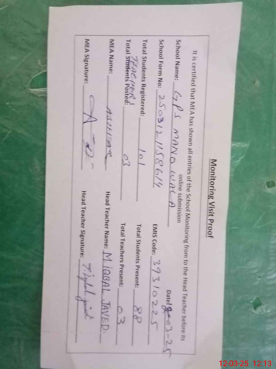 | EMIS Code: 39310225 | Name of School: GPS MANO WALA | |||