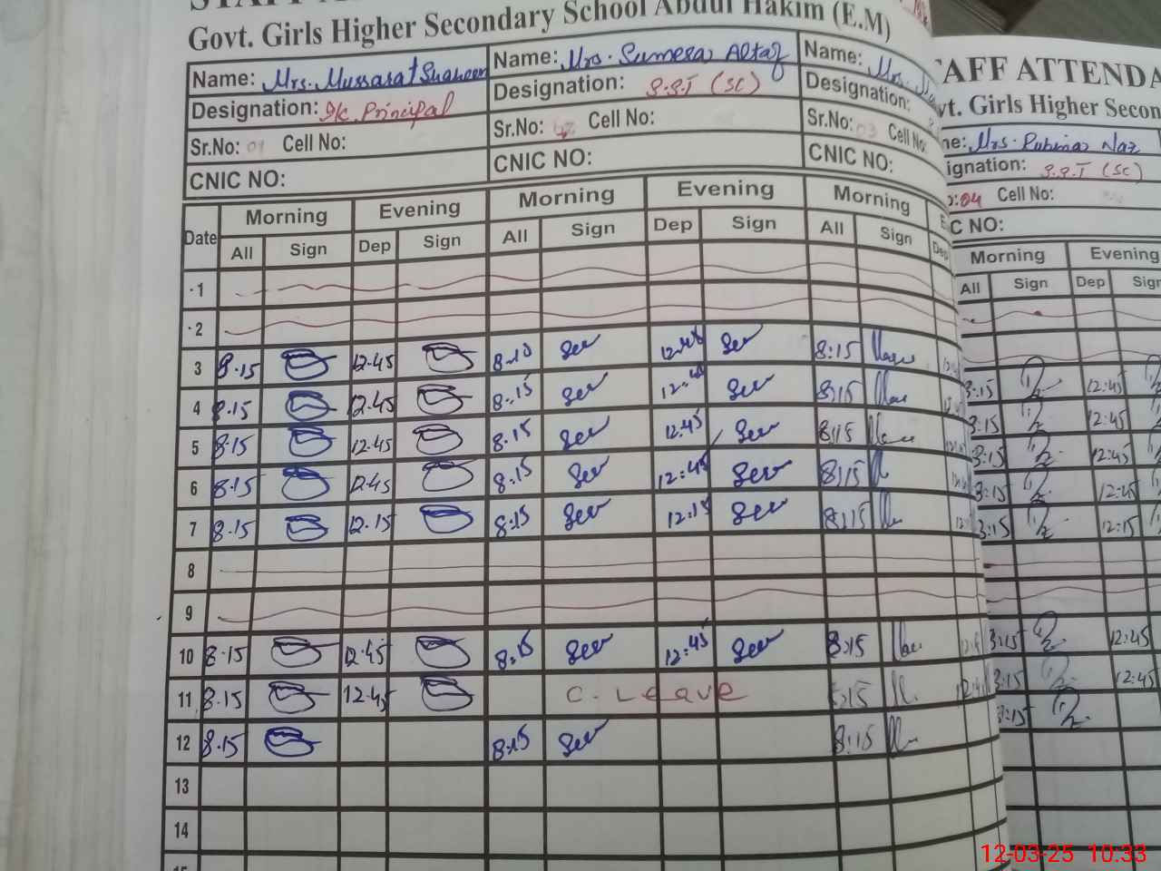 | CNIC | Full Name | Designation | R/C | Absence During Last Calender Month |