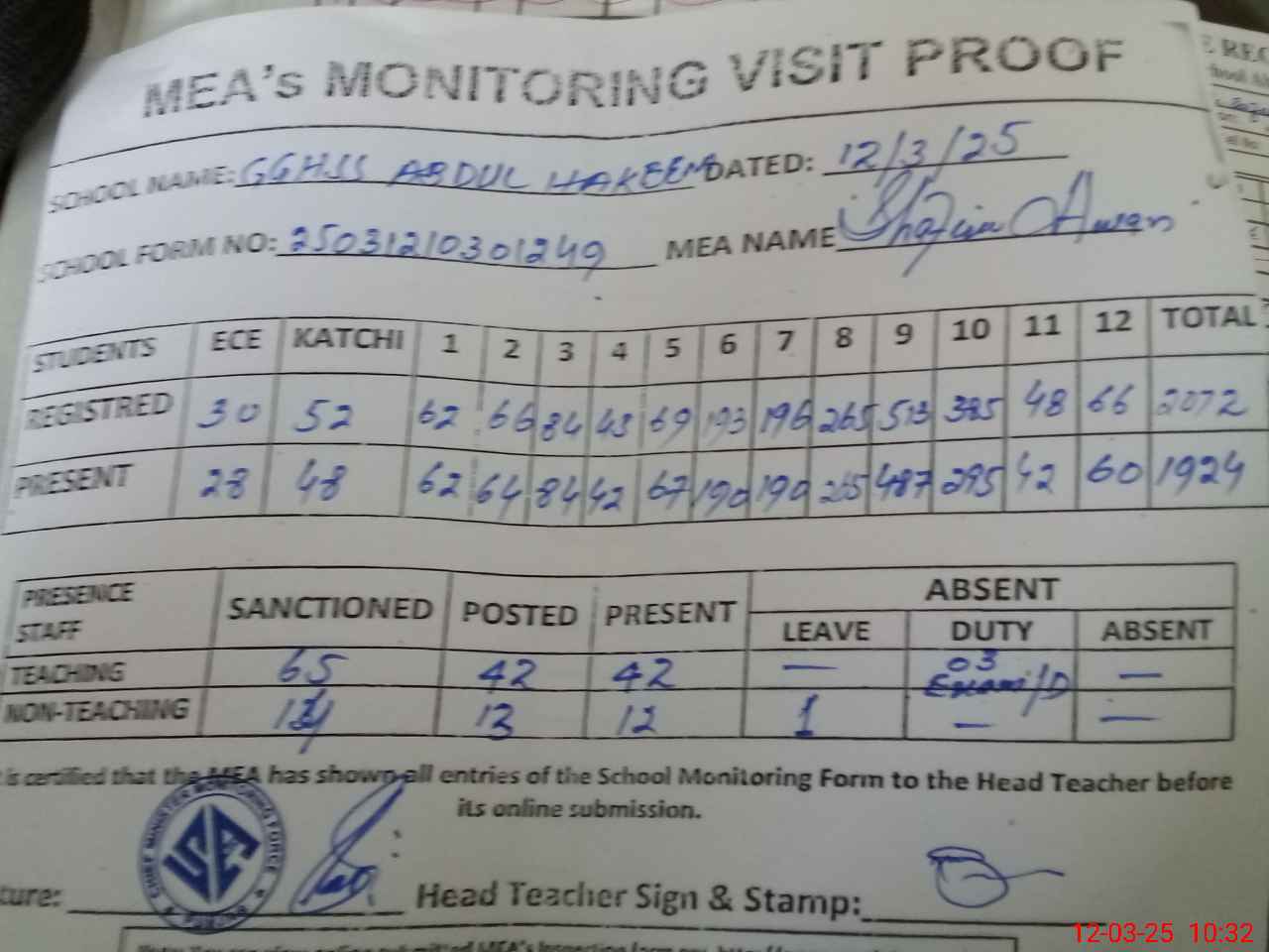 | Attendance Register | Head Teacher | MEA with School | Visit Proof |